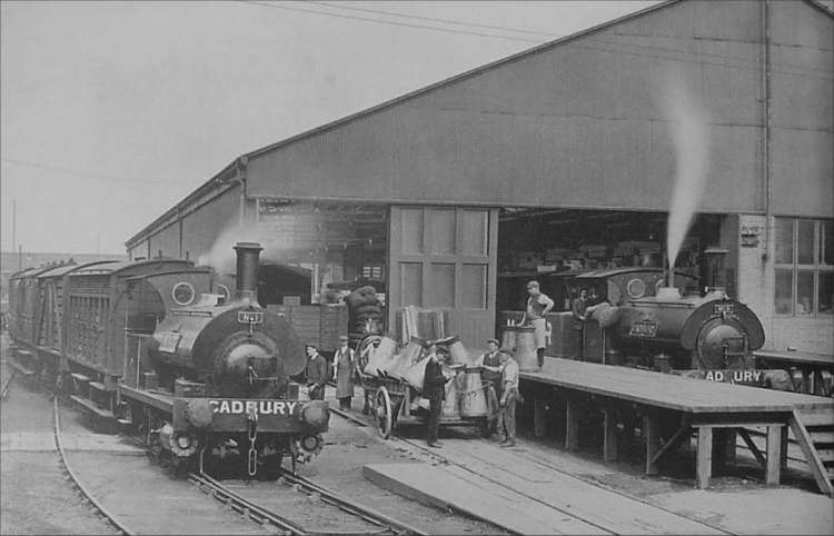 This open cab locomotive was the first to be delivered to the Cadbury factory at Bournville . This photograph was probably taken in the late 1880's and it is interesting to note that as well as two wagons with Midland Railway markings there is also one marked up as 'Cadbury Bournville.