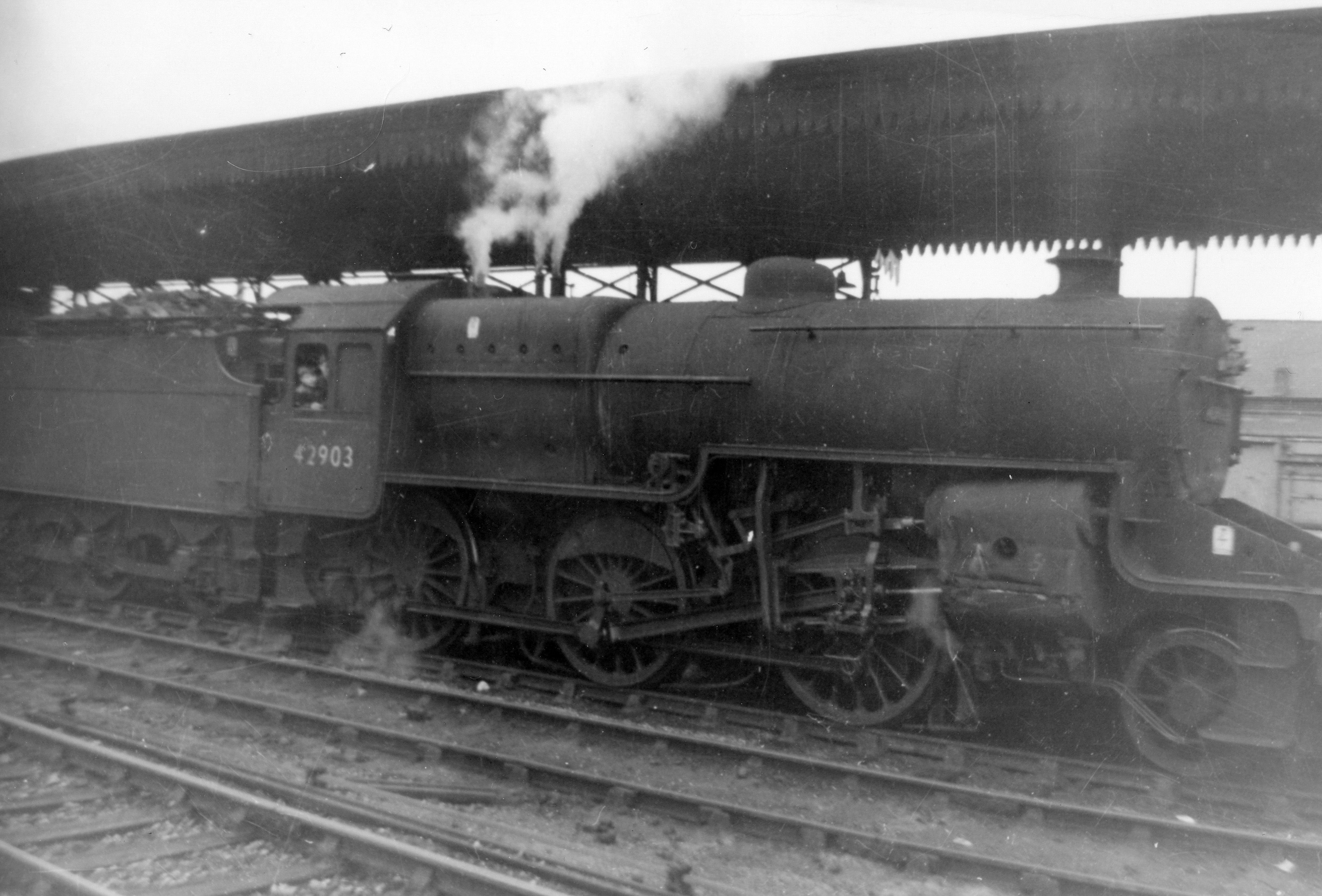 Amazingly this ex-LMSR Saltley based "Crab" 2-6-0 locomotive has steam to spare as it awaits the road at Worcester Shrub Hill Station.