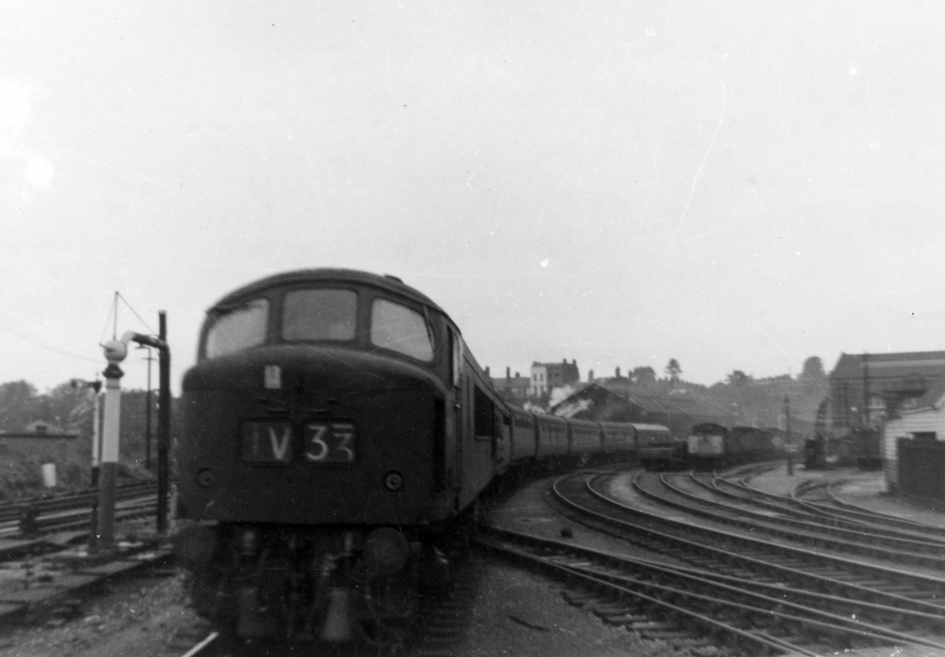 The transition from steam to diesel traction was well underway in 1962 with most express trains between Birmingham and Bristol switching to "Peak" class diesel locomotives. This one is unidentified as is the train, although by 1963 headcode "1V33" was used for the 08.10 Sheffield to Penzance "Cornishman" service.