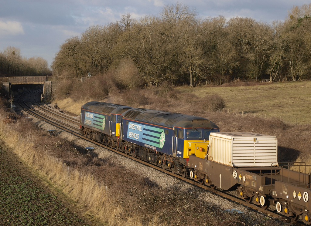 The Berkeley to Crewe nuclear waste trains continued to bring a good variety of motive power to the county in the early months of 2015. On 3rd February DRS livery class 57 diesel locomotives Nos.57002 and 57008 were bathed by the later afternoon sun as they passed Croome. Photograph taken by Robert Cooke.