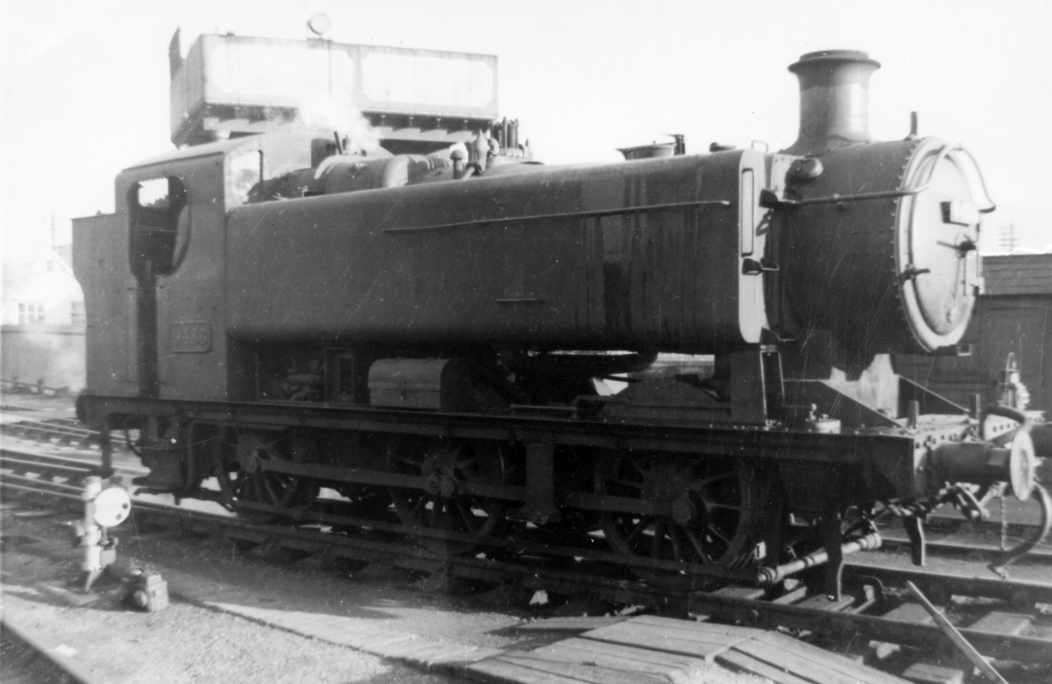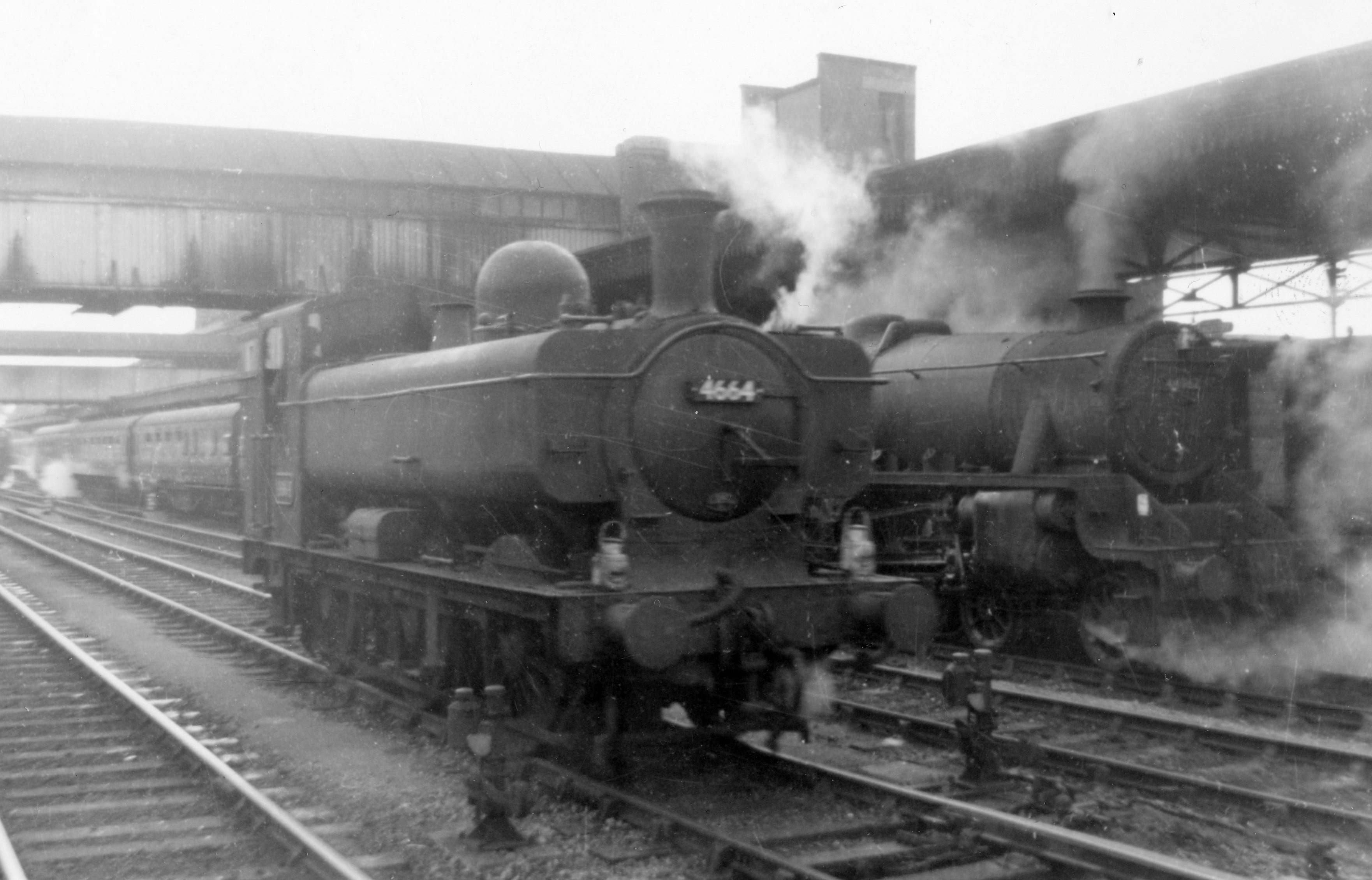 5700 class pannier tank No.4664 which spent its entire working life at either Worcester or Gloucester and is seen here standing in one of the two centre roads at Worcester Shrub Hill whilst an LMSR class 5 4-6-0 is awaiting departure from the 'down' (from Derby) platform with a train to Gloucester or Bristol.