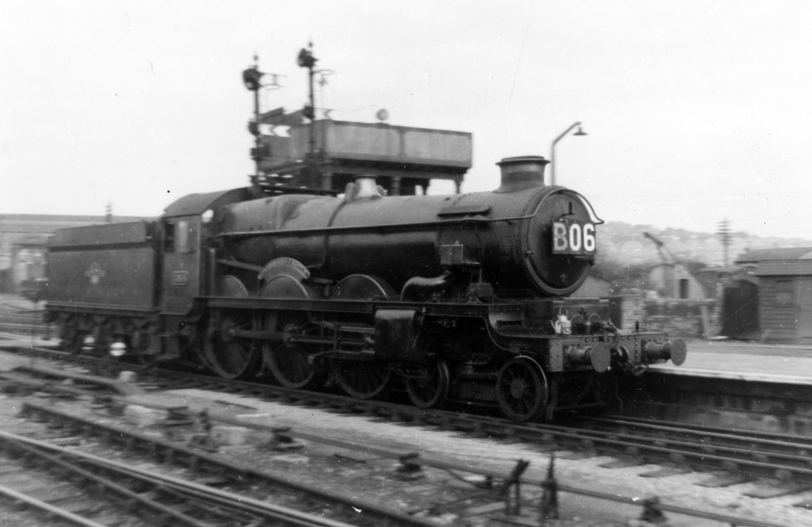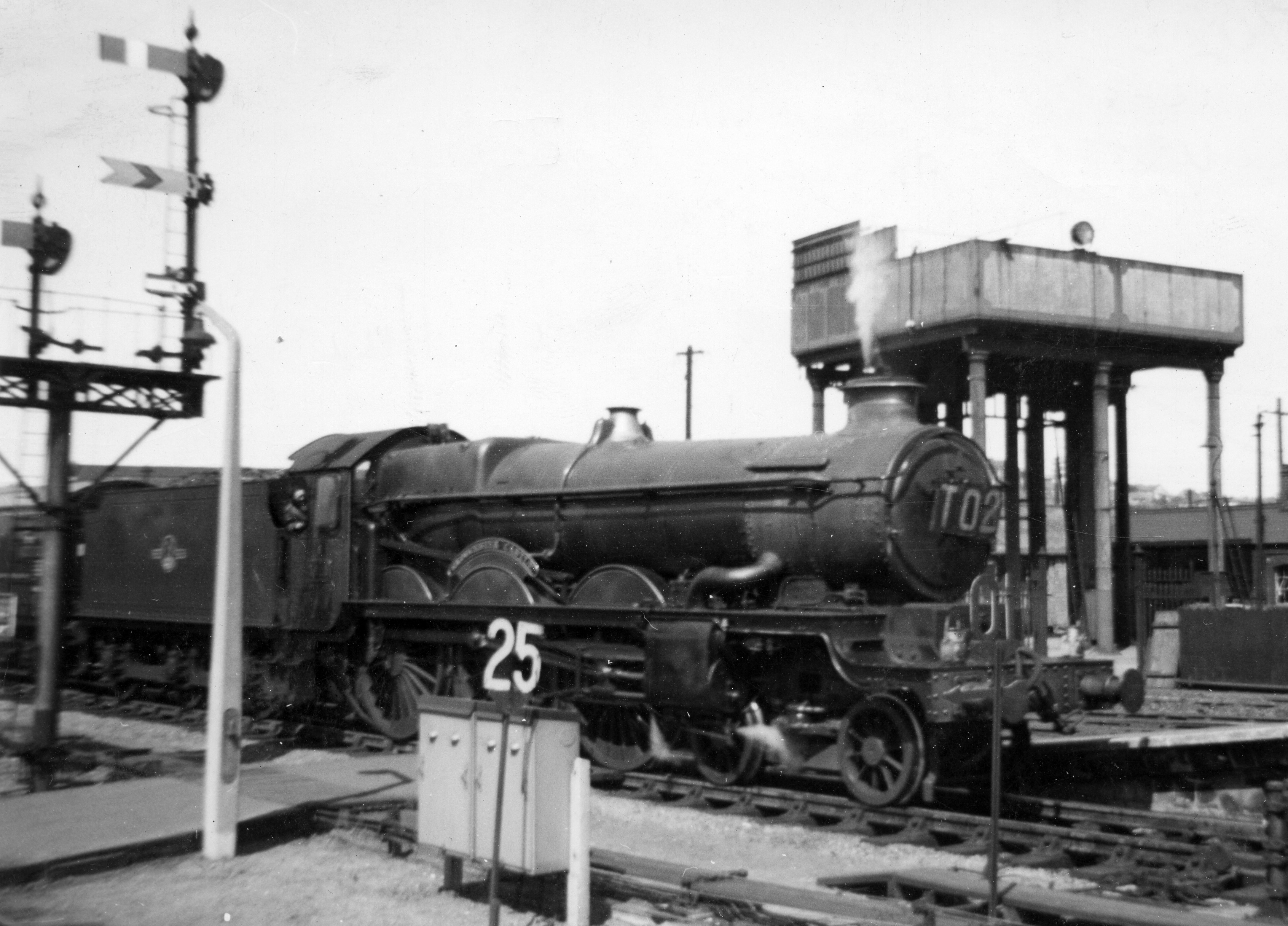 British Railway built "castle" class 4-6-0 No.7015 "Carn Brea Castle" of Old Oak Common Shed has just come off Worcester Shed to work an express passenger train back to the capital. The locomotive was withdrawn from service in March 1963.
