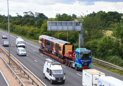 On 24th July 2020 Steve Widdowson was in the right place on a bridge above the M5 near Worcester in time to photograph an Allelys Heavy Haulage lorry with class 196 carriage No.122104 (from 196104) on its way from Newport, South Wales to Tyseley TMD for commissioning.