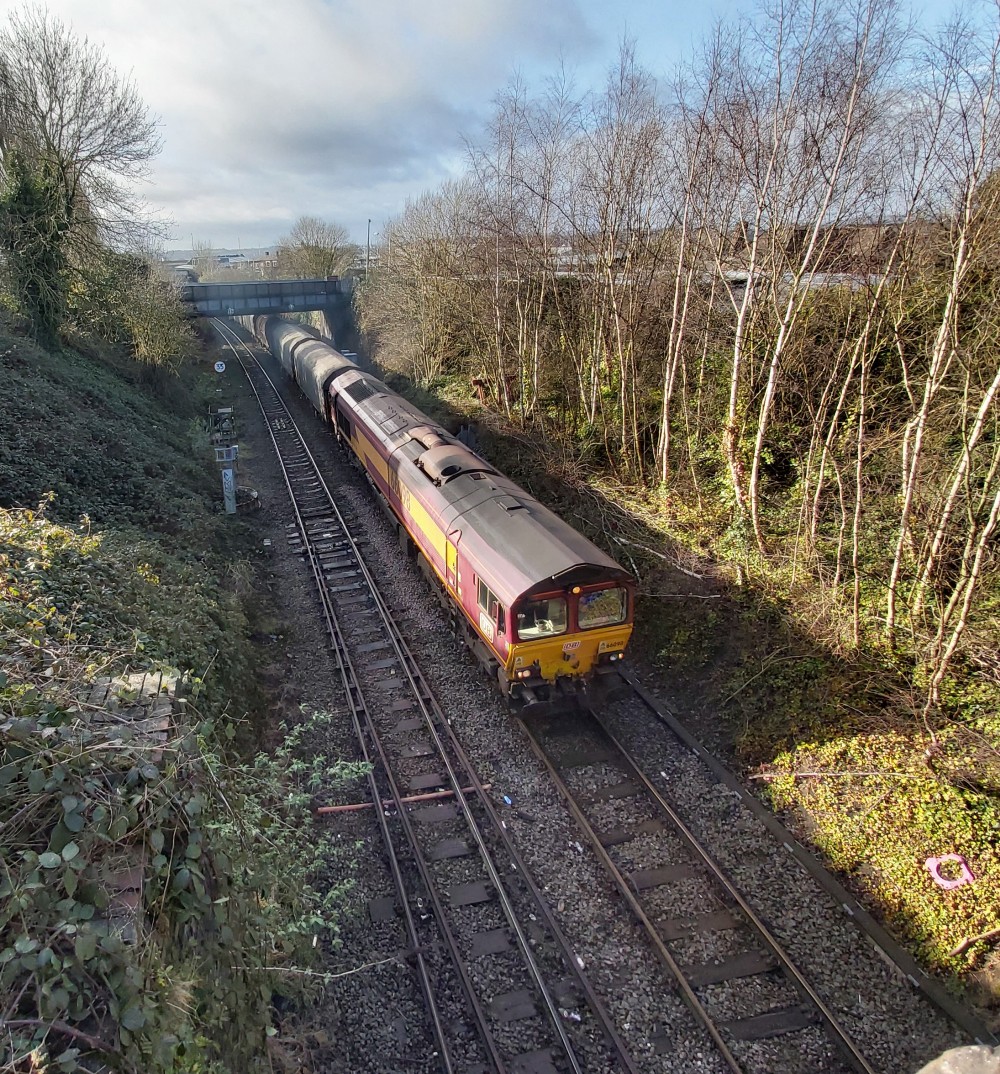 Class 66 diesel locomotive No.66098 was photographed by Andrew Smith on Monday 17th February 2020 as it approached Kingswinford Junction with the 04.30 from Margam to Round Oak. This is one of the few places on the line from Stourbridge to Round Oak where it is possible to photograph an eastbound loaded steel train. It is also rare to find a Round Oak bound train working at this time as this train usually runs at night (Kingswinford is actually in Staffordshire but Stourbridge where the branch line starts is in Worcestershire.) The once busy Junction and steel terminal lies derelict behind the photographer, although the track to Pensnett is still in place and the points in full working order, presumably in the hope of revival in the future.