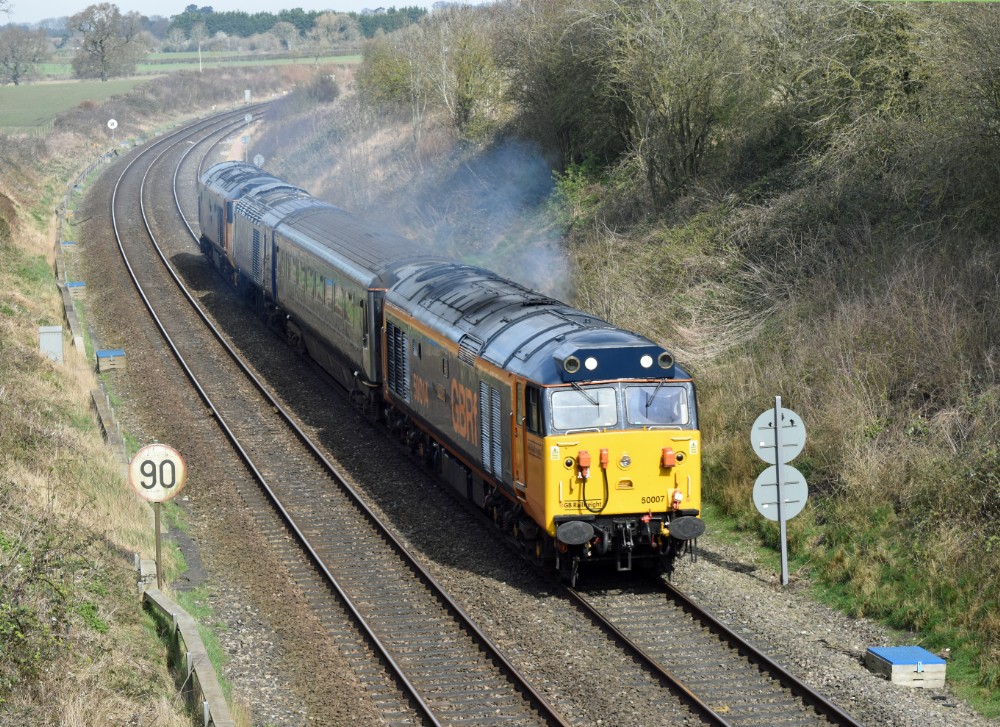 This strange working on Monday 23rd March 2020 saw a pair of class 50 diesel locomotives (Nos.50007, also known as 50014 and No.50049) work from Kidderminster (SVR) to Long Marston. Here they picked up an HST carriage and power car and took them (via a reversal at Norton Junction) to Plymouth Laira depot. Andrew Smith photographed the train (code 5Z44) at Abbotswood Junction.