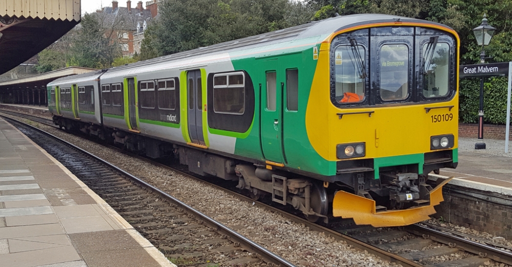 London Midland livery class 150/1 two-car diesel multiple unit No.150109 (one of three units of this class retained by the operator after the introduction of class 172 units) seen at Great Malvern Station with the 10.49 from Birmingham New Street to Hereford (train code 1V25). Photograph taken by Andrew Smith on 25th April 2016.