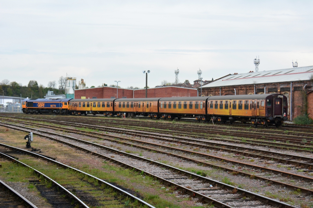 Steve Widdowson took this fascinating photograph of 'Teak' 4TC Electric Multiple Unit cars Nos. 76324, 70823, 71163, 76297. The set was being hauled by GBRf livery class 66 diesel locomotive No.66770. The train (code No.5M66) was the 05.35 from Tonbridge West Yard to Kidderminster. The EMU had been brought to the Severn Valley Railway for use during the diesel gala weekend at the end of May 2016. Photograph taken on 21st April 2016.