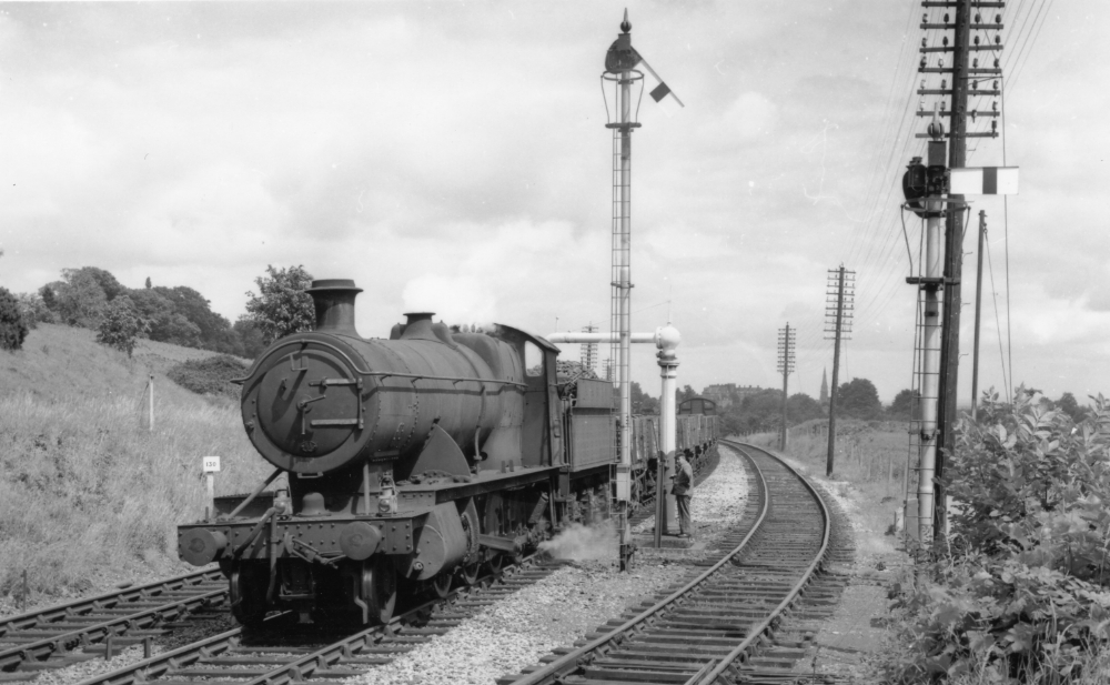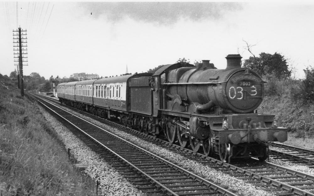 There is a separate entry for New Midland Sidings where the ex-Midland Railway line to Ashchurch diverged towards Malvern Wells (Hanley Road) Station and Tewkesbury. Beyond the junction the line continues to Malvern Wells (GWR) Station. Ex-GWR "Castle" class 4-6-0 steam locomotive No.7002 "Devizes Castle" of Worcester shed (a recent transfer which had not yet had the attention of 85A's cleaners) has charge of the Hereford portion of the 'down' "Cathedrals Express".