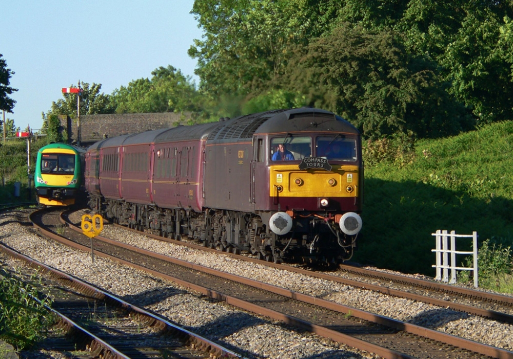 On 4th June 2011 Compass Tours used West Coast Train Company's class 47 diesel locomotive No.47825 as motive power on 'The Pennine and North East Explorer' special train (No.2X54) from Hereford (depart 06:20) to Durham. Robert Cooke photographed it bursting though Peachfield Road bridge as class 170/5 two-car diesel multiple unit No.170507 passed with the 06.40 London Midland service from Worcester Shrub Hill to Hereford.