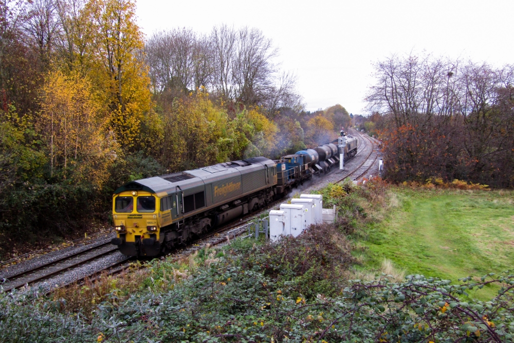 Below: This photograph was also taken from the overbridge Peachfield Road and shows Freightliner livery class 66 diesel locomotives Nos.66513 and 66523 with a rail head treatment train on 15th November 2016. Photograph taken by Andrew Smith.