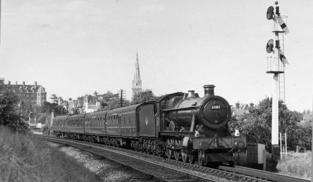 This Tim Farebrother photograph, which dates from about 1960, shows ex-GWR "Hall" class 4-6-0 steam locomotive No.4973 "Sweeney Hall" of Hereford shed approaching Great Malvern Station with a 'up' train possibly bound for Birmingham Snow Hill. The photographer was standing at the south end of the station with Great Malvern Signal Box on the left hand side. This is a view looking towards Malvern Wells. The first road to pass under the railway as it heads south towards Malvern Wells is Clarence Road but photography has never been possible at tha spot.