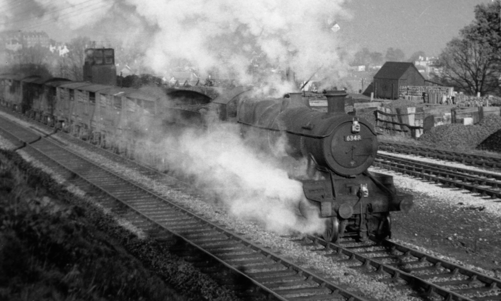 The line climbs steadily between Great Malvern and Malvern Wells making for hard work for the crew of heavy freight trains such as this one powered by ex-GWR 2-6-0 steam locomotive No.6348 of Worcester shed. The small building on the right hand side is the weighbridge which was still extant in 2017. Photograph taken by Tim Farebrother.