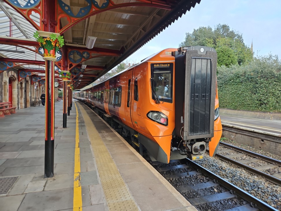 New class 196 diesel multiple unit No.196107 in the striking livery West Midlands Railways pauses at Great Malvern Station to pick up passengers. The train is code No.1M67, 13.40 Hereford to Birmingham New Street on Wednesday 22nd January 2025. Photograph taken by Andrew Smith.