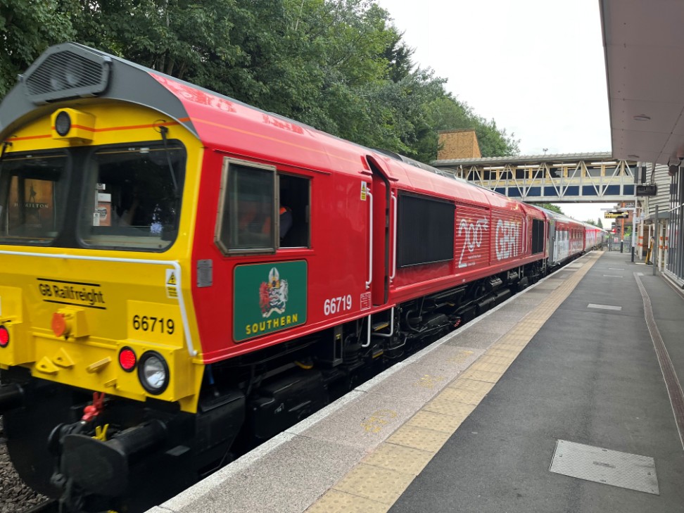 On 20th May 2025 GBRf liveried class 66 diesel locomotive No.66719 "200" went through Kidderminster Station with several carriages specially adorned with logos "celebrating 200 years of train travel since 1925" to mark 200 years since the opening of the Stockton to Darlington Railway. Photograph taken by Pete Stamper.