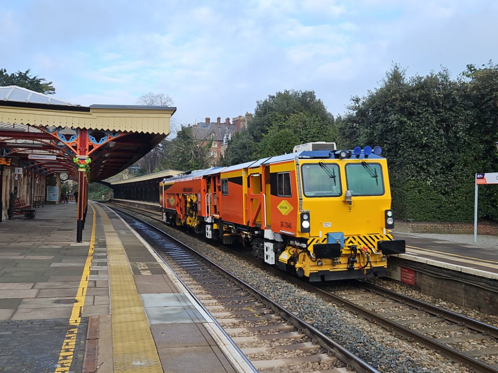 Colas livery tamper (built by Plasser & Theurer) No.DR 73948 (James Dean) photographed at Great Malvern with train code No.6J63, the 11.53 Rugby to Ledbury, in connection with a six-day closure of the line to Hereford from 26th January 2025. Photograph taken by Andrew Smith on 22nd January 2025.