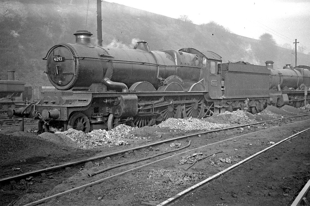 Proudly displaying its 85A (Worcester) shed plate was Castle class" 4-6-0 No.4093 "Dunster Castle, photographed in the shed yard at its home depot. The other Dunster Castle is is owned by the National Trust and is in the village of Dunster, Somerset. The photograph was taken shortly before the locomotive was transferred to Gloucester in 1964.