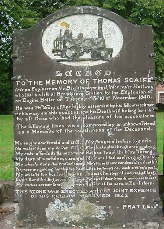 Thomas Scaife and Joseph Rutherford were two unfortunate employees of the Birmingham and Gloucester Railway who tragically lost their lives when the boiler on a steam locomotive exploded at Bromsgrove on 10th November 1840. A craftsman was commissioned to produce the impressive grave stones. Unfortunately he drew a 4-2-0 locomotive built by Norris; rather than the correct locomotive which was a 2-2-0 named ‘Surprise’. Something that no doubt today would have resulted in a libel action. Scaife was killed instantly but Rutherford died the following day.