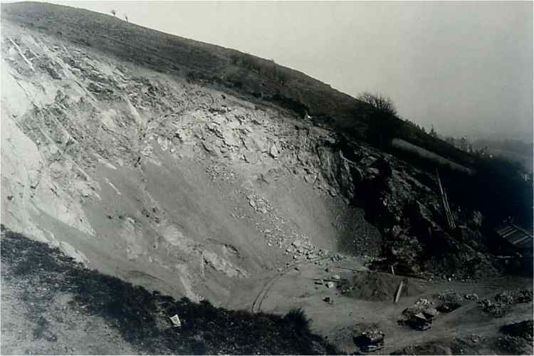 This photograph, which is a close up view of the right hand part of the previous one, shows a partly filled narrow gauge skip at the quarry face.