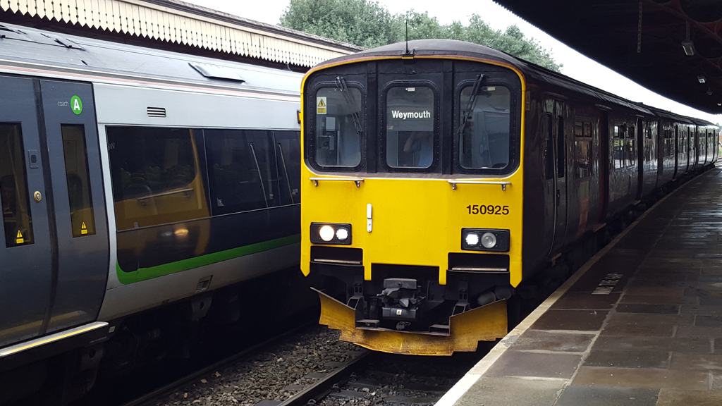 class 150 three-car hybrid unit No.150925 instead of the normal class 158 three-car unit. The late arrival of the incoming working from