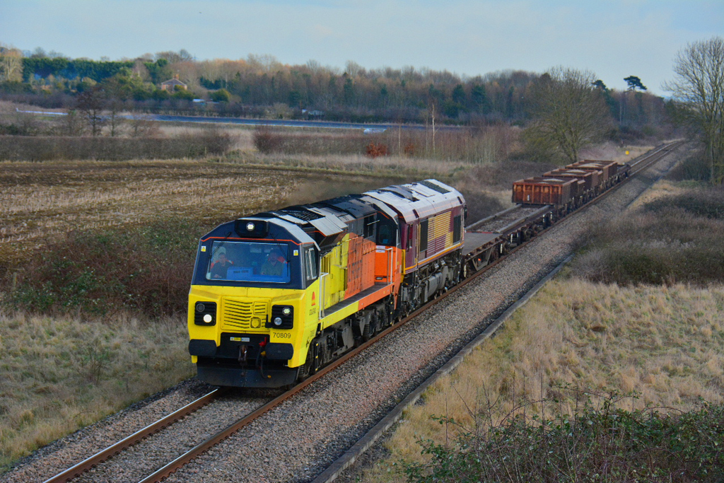 On 3rd February 2015 Colas livery class 70 diesel locomotive No.70809 towing DB Schenker Class 66 No.66176 on the 6M50 from Westbury to Bescot