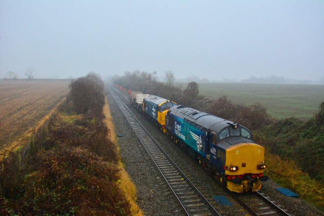 Class 37 diesel locomotives Nos.37218 and 37558 " Avro Vulcan XH 558 " (also known as 37424) heading train code No.6M63, the 11.58 Bridgwater to Crewe flasks. Photograph taken on 6th December 2016 by Steve Widdowson at a foggy Besford in Worcestershire.