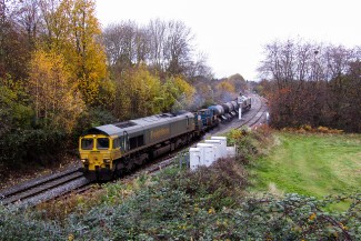 The reign of the class 56s on the Rail Head Treatment train No.4 came to an abrupt end on 7th November when class 66 diesel locomotives Nos.56104 and No.56105 failed at Ashchurch. More reliable motive power arrived from Bescot in this pair of Freightliner livery class 66s. The photographs, taken by Andrew Smith, show No.66513 (left) and No.66535 (right) at Malvern Wells on Tuesday 15th November 2016.