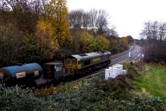 The 2016 Rail Head Treatment Train season was handled in the county by a pair of filthy Colas livery class 56s (Nos.56078 and 56301). Not even the late autumn sun could penetrate the dirt as the train passed Malvern Wells on 2nd November 2016. Photograph taken by Robert Pritchard.
