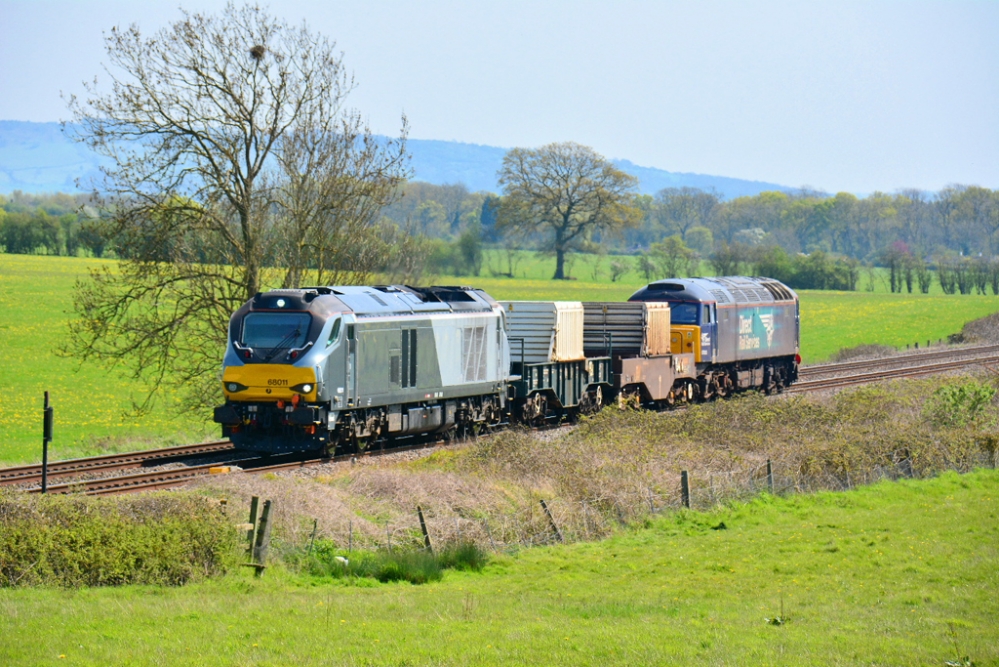 On 21st April 2016 Freightliner livery Class 70 diesel locomotive No.70006 ran from Long Marston to Southhampton via Worcester yard where it ran round its 2 wagon flats, then back down the Cotswold line to Oxford and on to Southampton. This was the first time a Freightliner class 70 had run over the Cotswold line as previously only Colas 70ss have worked over this line. Photogrpah taken by Steve Widdowson at Stoulton, near Pershore.