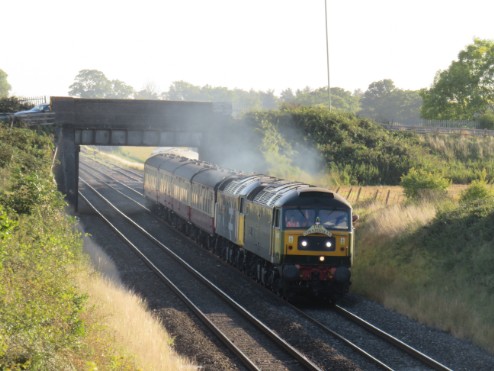 This photograph was taken shortly after 11am on Saturday 14th May 2011 and shows class 47 diesel locomotives Nos.47832 'Solway Princess' and 47712 'Pride of Carlisle' travelling at high speed along the elevated section of the ex-Birmingham & Gloucester Railway between Eckington and Bredon with the stock of the Northern Belle en-route from Crewe to Bath. Photograph taken by Robert Cooke.