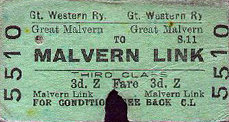 The railway ticket (above) was issued by the Great Western Railway for third class travel from Great Malvern to Malvern Link. This journey is barely one mile in length and it is possible to see one station from the other.