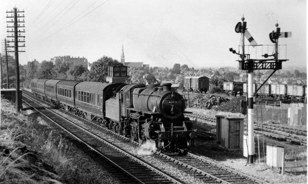 In the steam era it was possible to obtain an unobstructed view across the railway to New Midland Sidings. By 2016 trees and vegetation had made it impossible to take a picture from here. Tim Farebrother took this detailed study of ex-LMSR class 4 steam locomotive No.43013 of Saltley Shed on a train from Birmingham New Street to Malvern. In the background five coal trucks and two covered vans are in the sidings and the remains of the water tower are clearly visible.