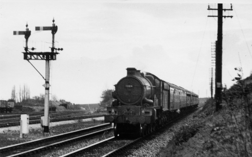This interesting photograph shows ex-GWR "Castle" class 4-6-0 steam locomotive No.5084 "Reading Abbey" of Worcester shed with the Hereford to Worcester Shrub Hill portion of a London bound express. The photograph shows the short remaining part of the ex-Midland Railway branch line to Tewkesbury and Ashchurch. The section of this line from Malvern & Tewkesbury Junction to Upton-on-Severn had closed in December 1952 but a long siding towards Peachfield Road remained in place until the late 1960s. Part of New Midland Sidings can be seen on the left hand side. Tim Farebrother took this photograph about 1960.