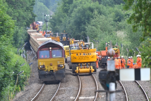 Top left shows class 66 diesel locomotive No.66128 on the 'up' line whilst the 'down' line is being renewed. The sister class 66 in the background is standing opposite to the site of New Midland Sidings.