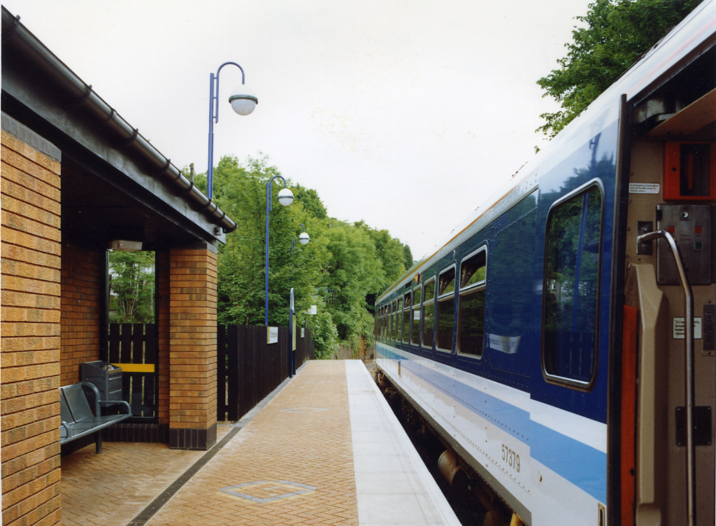 Taken in 1994, shortly after the opening of the new station, this photograph shows the passenger waiting accommodation adjacent to class 153 railcar No.153379. Copyright MIAC/Halcrow Fox collection.