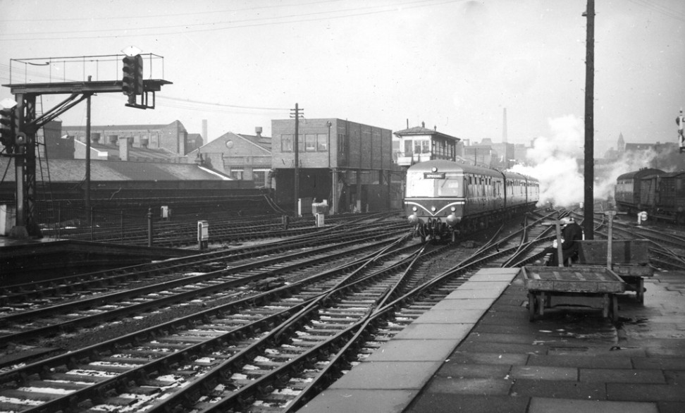 On 22nd May 1959 a Gloucester Railway Carriage & Wagon Co three-car 'Cross-country' (later class 119) diesel Multiple unit (car Nos.51063, 59422 & 51091) prepares to depart from Birmingham Snow