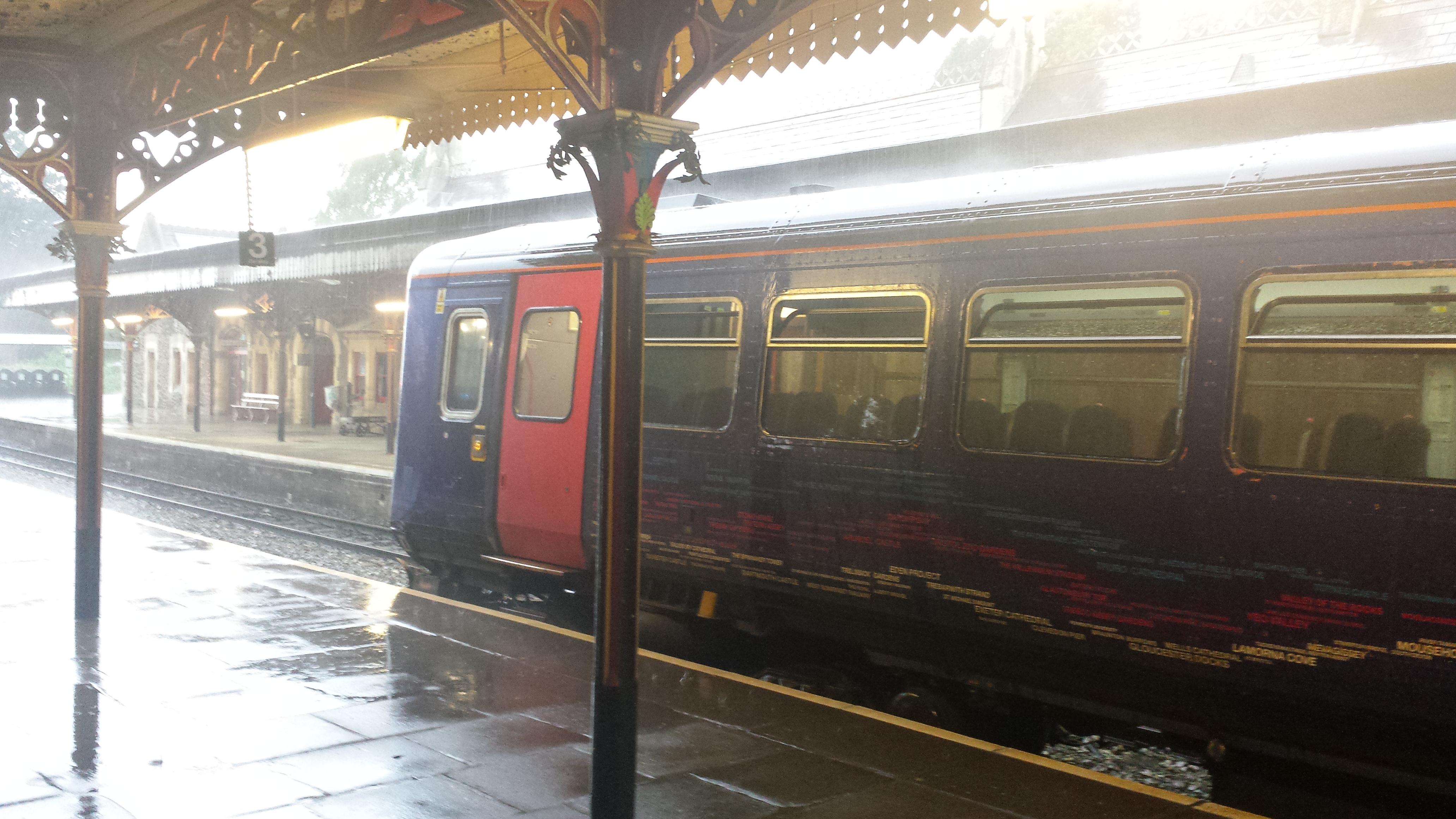 (12.25 Hinksey yard to Bescot) was re-routed via the North Cotswold line and Steve Widdowson photographed it passing Lower Moor near Pershore. A massive thunderstorm greets the arrival at Great Malvern of First Great Western class 153 single car No.153305 (plus class 150 two-car diesel